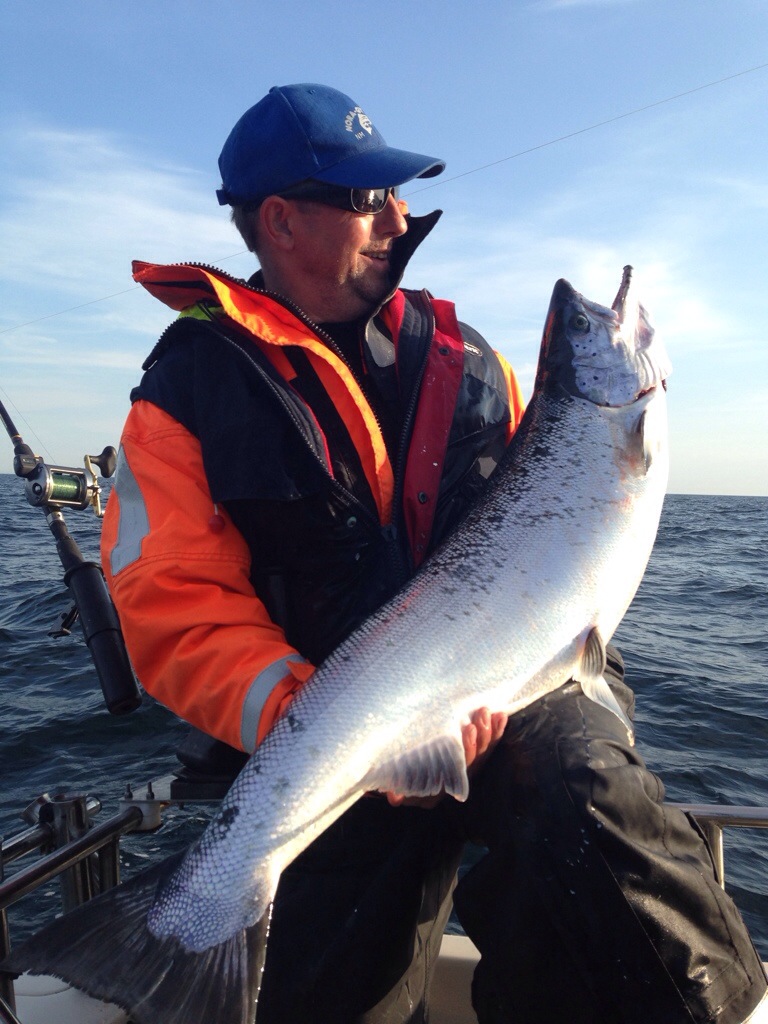 Vi fick bra fiske även idag utanför Ystad. Idag gick laxarna lite högre upp i vattnet dom flesta tog i ytan med bly ca 50 gr. Det blev riktiga rullskrik i tekotan när det small på. Leif tog den här resans sista lax som vägde ca 11 kg. Fiskehälsningar Henrik.
