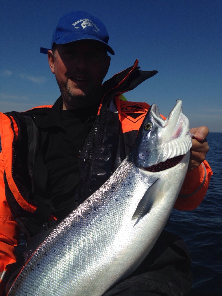 Laxarna är på riktig bra humör idag. Senaste fick Leif dra upp den tog på 90 fot. Fiskehälsningar från ett soligt Östersjöhav.
