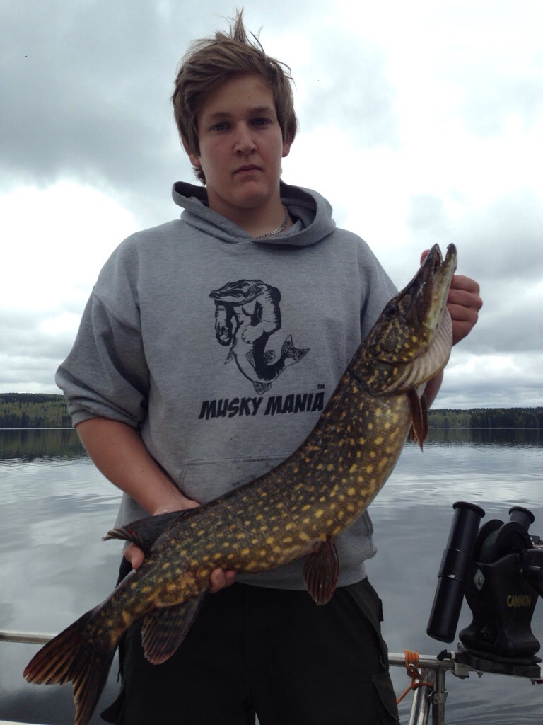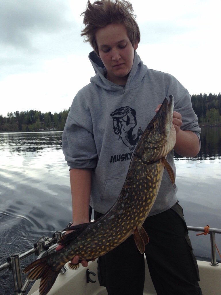 Idag hade jag med Jocke Eriksson i båten som är en av klubbens duktiga juniorer. Vi trollade på en mindre sjö i hemmatrakten. Jocke drog upp 2 gäddor i 5 kilos klassen som toppfiskar. Bästa bete idag var Rapala Taildancer guld/orange fiskad 3 meter bakom spöparavanerna. Trevlig Fiskehelg Henrik.