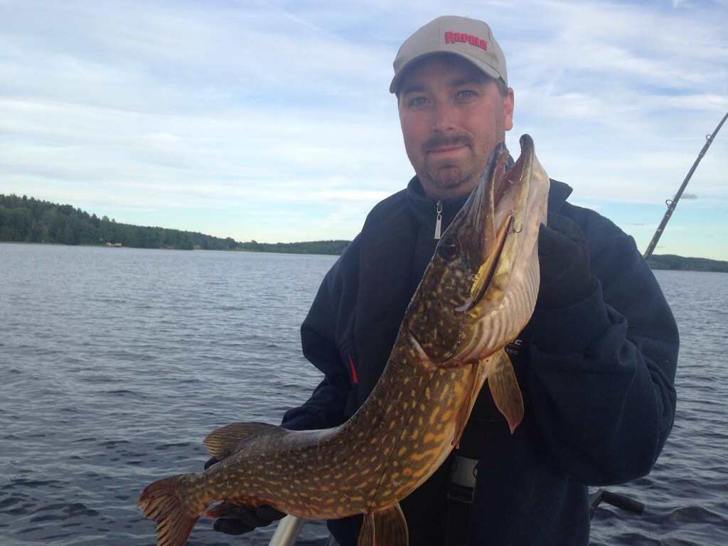 Ikväll är jag med Nille på sjön. Första fisken blev en gädda som tog en scatter oblyat i ytan.