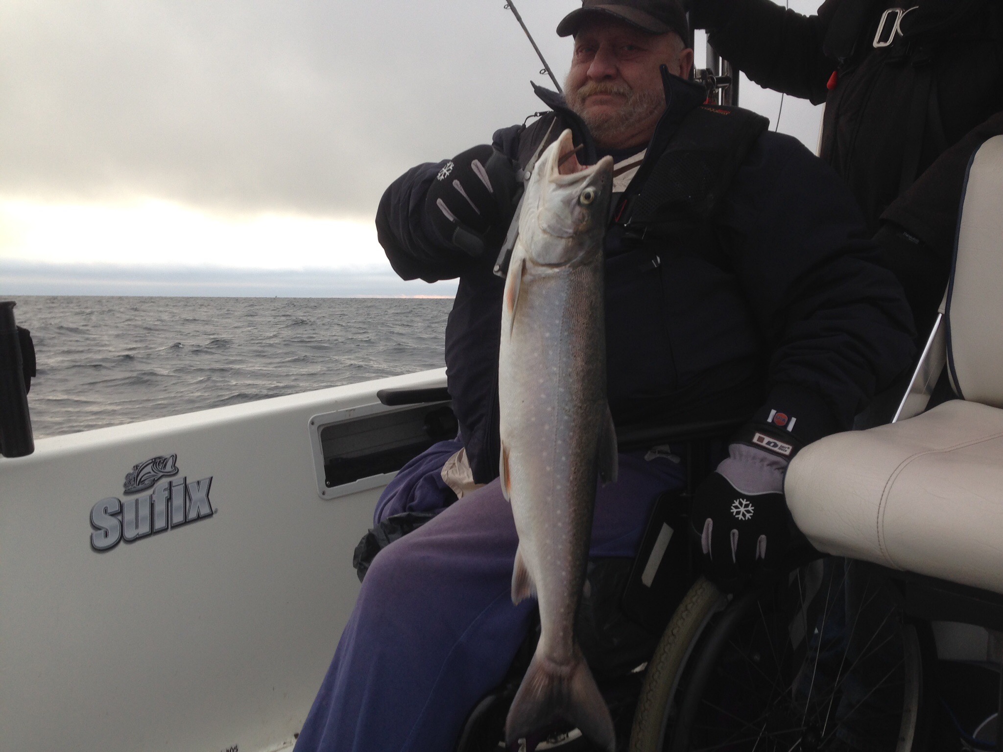 Idag hade jag besök av Börje som sitter i rullstol. Han ville testa laxfisket på Vättern. Någon lax fick han inte men en super fin röding på 66cm blev dagens största fisk. Tre fiskar släppte vi åter pga lekdräkt. Mvh Ove