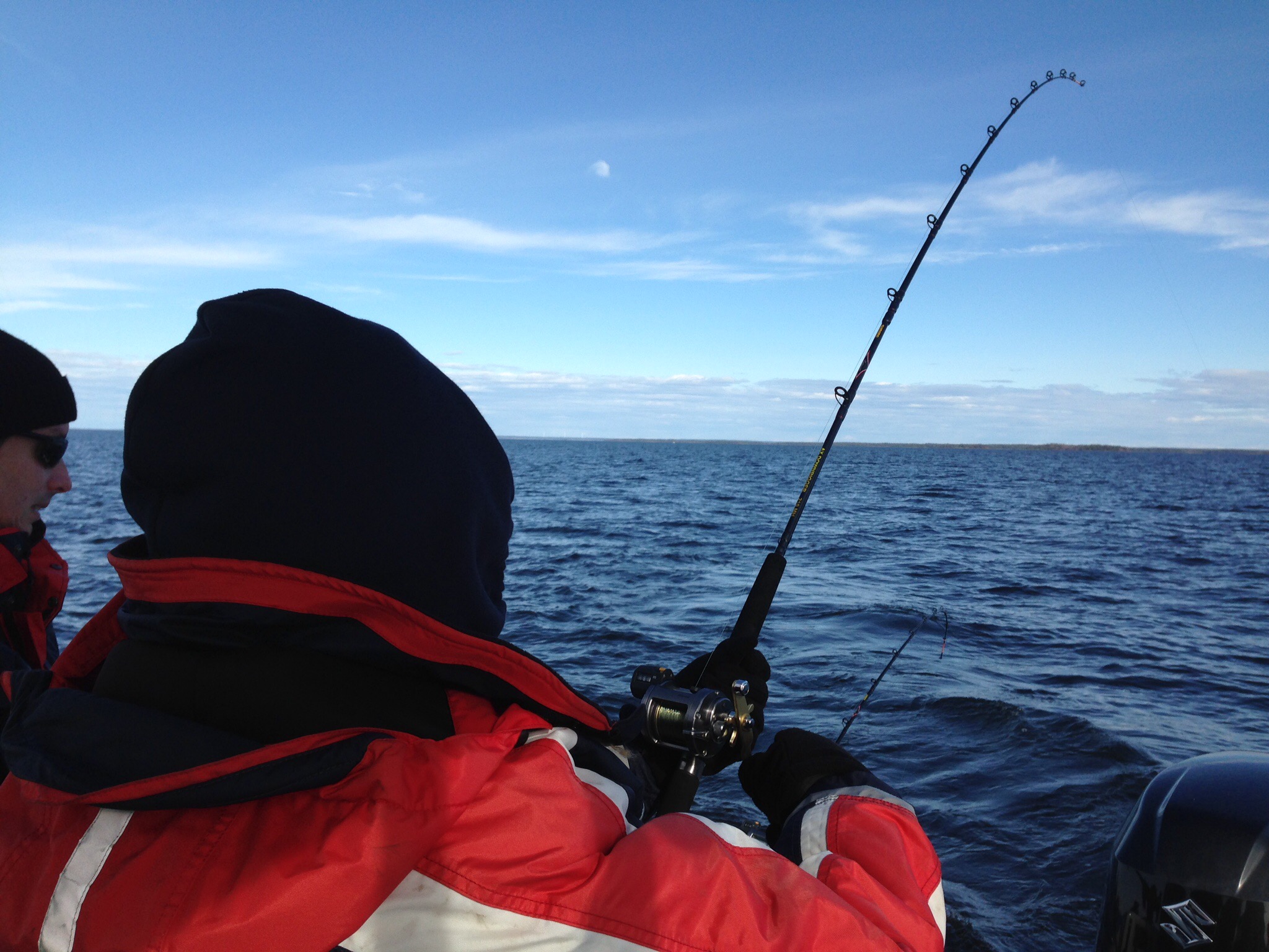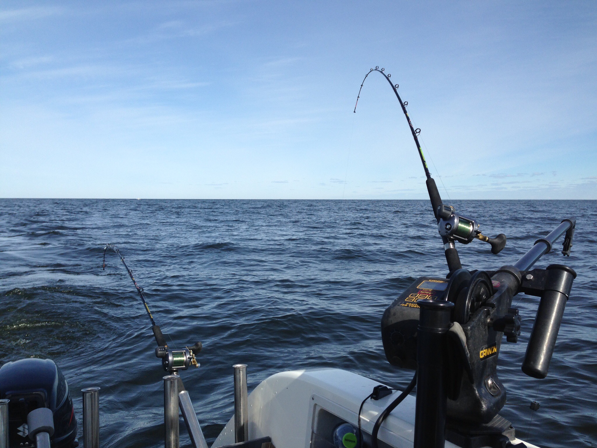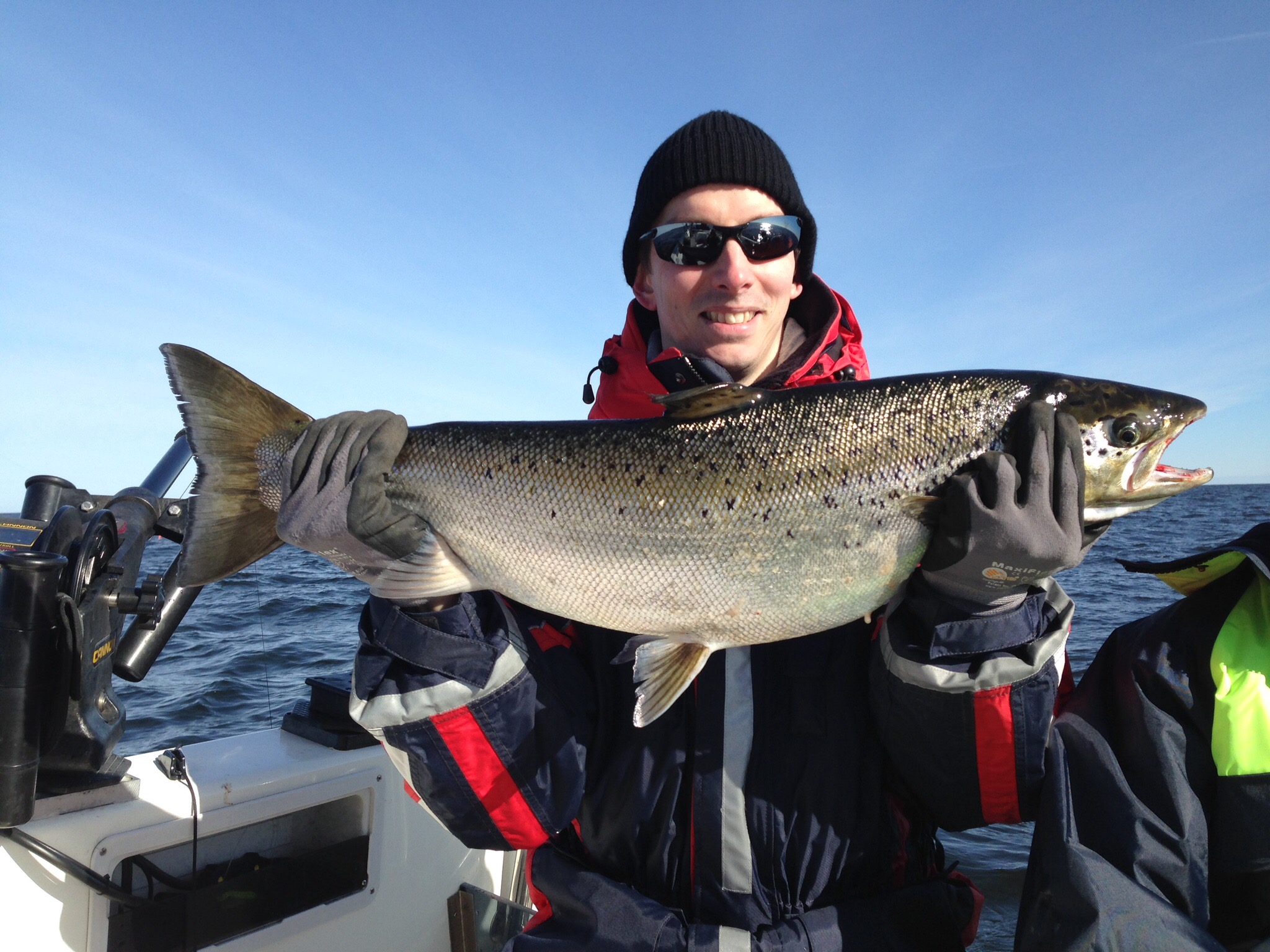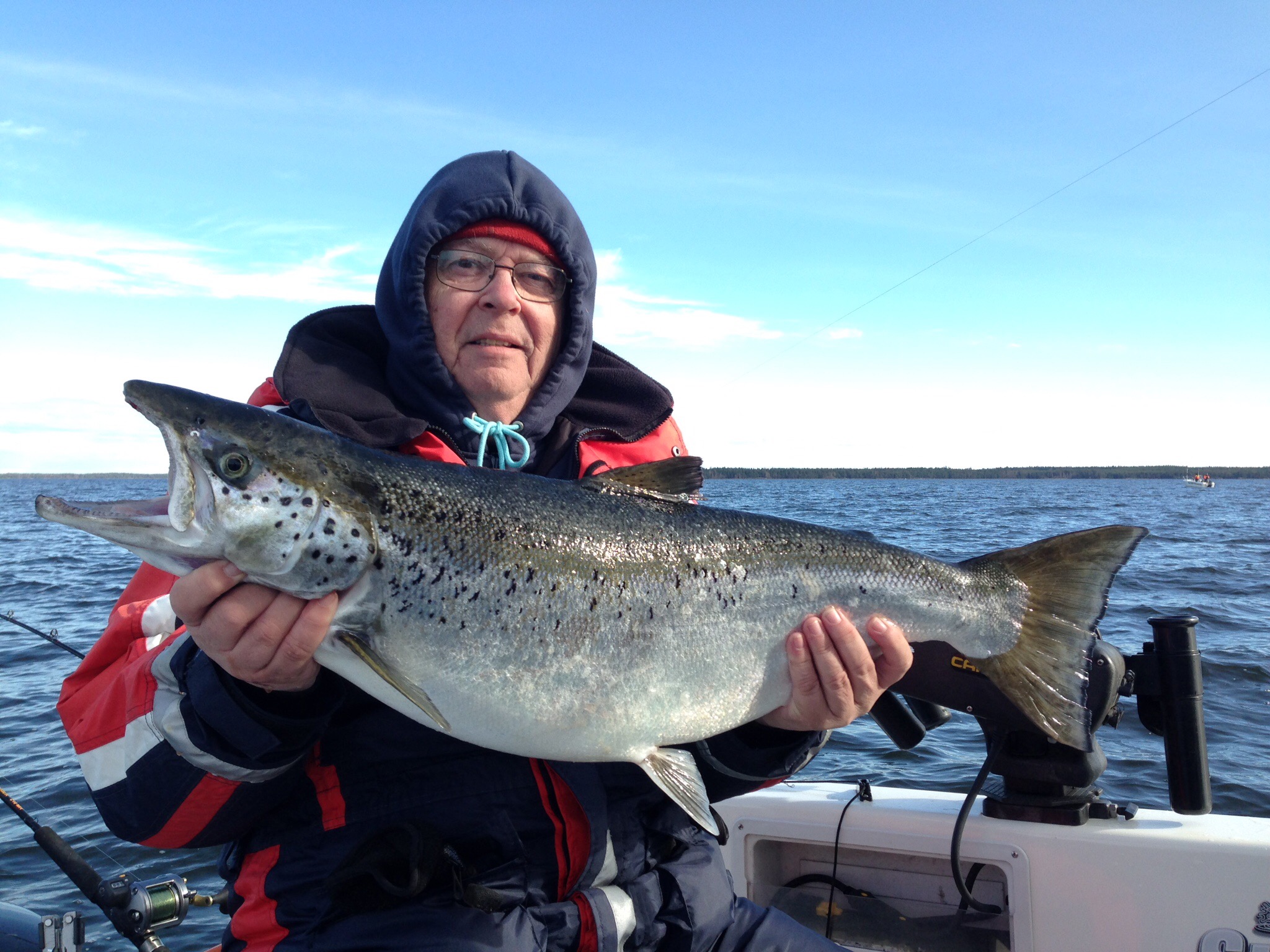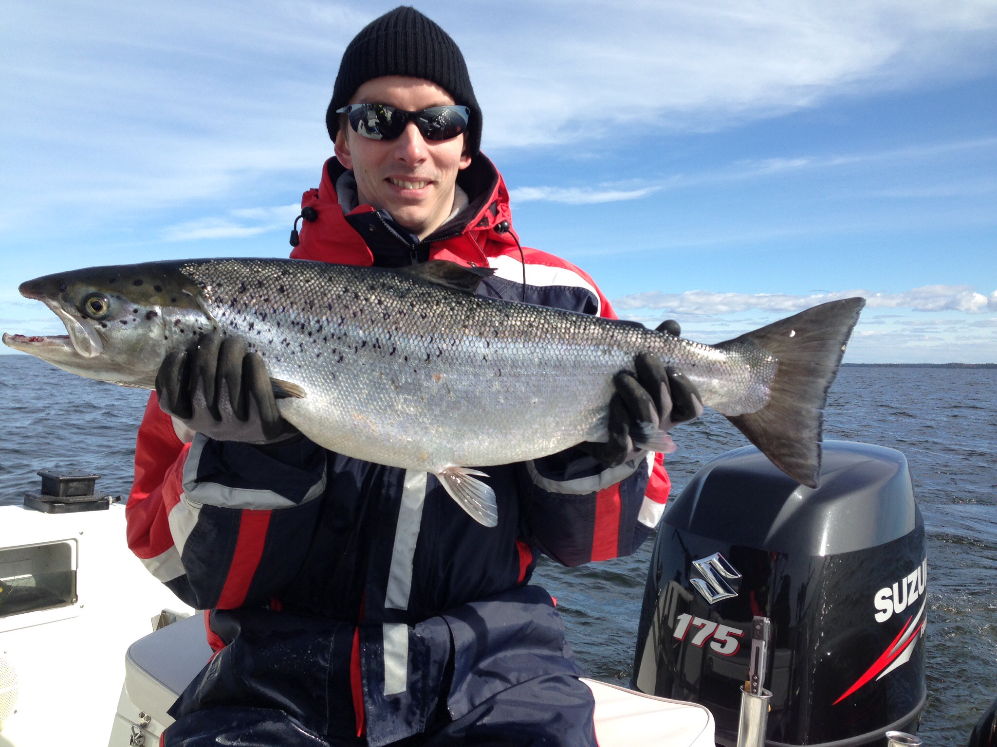 Idag har det lyfts stora laxar ute på Vänerns vidder. Det började med att en rapport från min kompis Anders Olsson lyfte en 6,5 kgs lax på utlägg. Sen ramlade det in ett sms om en på styva 9kg. Vi själva hade dunderfiske och landade fler +5 kgs. I slutet på dagen, precis efter att gästerna var klara med att det var dags att åka i land högg en storfisk på ytan. Tekota rullen knarrade ilsket och det var ingen tvekan om att det var tyngd i fisken. Efter en stenhård kamp kunde jag näta en 8,8kgs lax! Vilken avslutning på en fantastisk dag. Fem laxar med medelvikt över fem kilo med i hamn. Plus en hel del returer och vildingar. För den som vill känna på storlaxen är det dags och boka en tur nu. Det finns lediga dagar och vädret ser mycket gynnsamt ut. Bokning sker lättast på telefon 0706/762908 eller e-post info@charterfiske.se. I kväll somnar jag tidigt. Mvh Ove