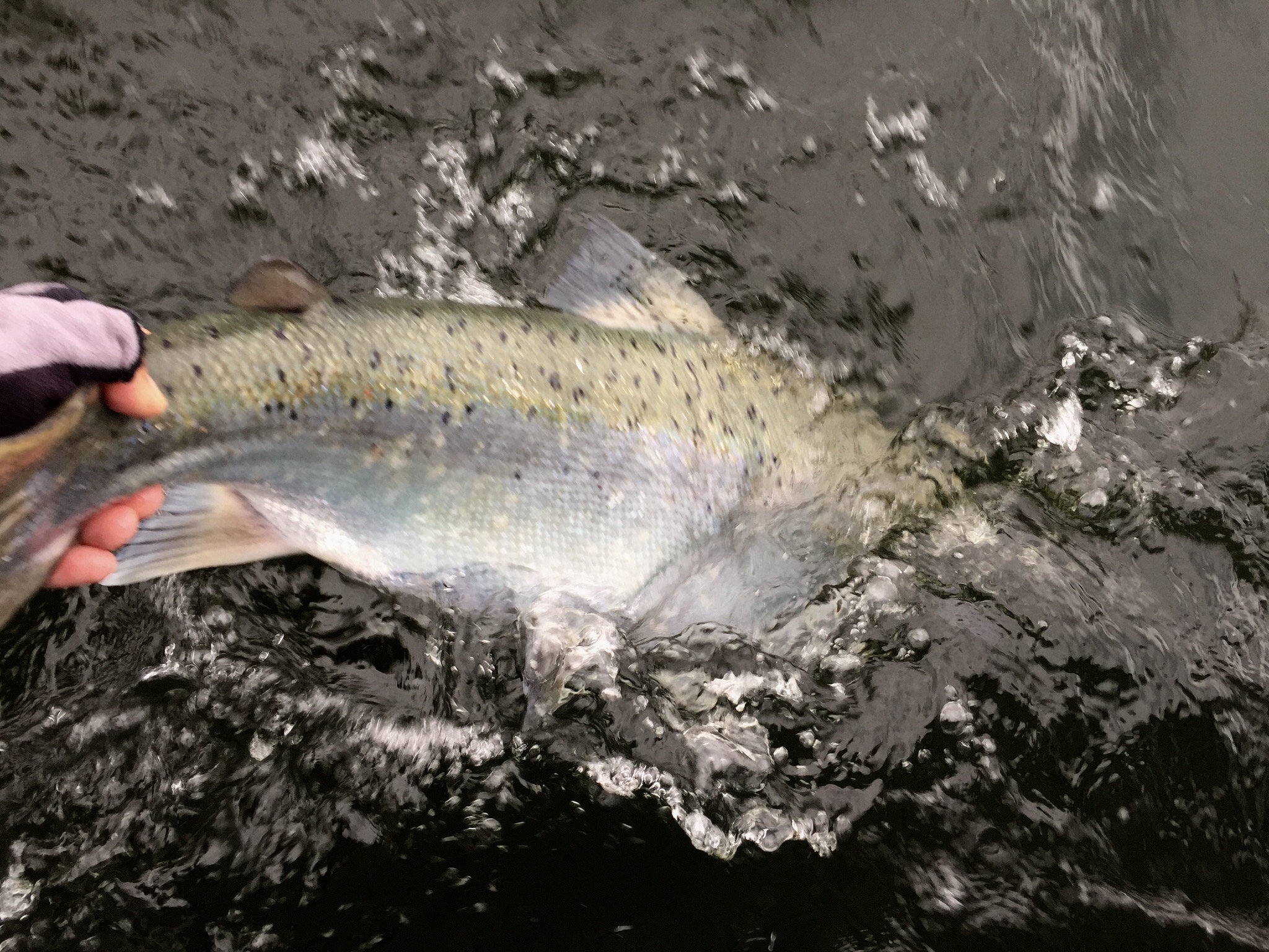 Efter att vi lämnat bryggan och transporterat oss ut till fiskeplatsen åkte spöna i sjön med rask takt. Först tre ytspön och sen två riggspön. När jag skulle sätta spö nr 2 på djupriggsvajern drog det till stenhårt i vänsternäven! Jag drog lika hårt tillbaka och vrålade fisk! Oskar greppade spöt som fortfarande stod i djupriggen och på började fighten med fisken. Linanflög i rask takt ur Tekotarullen. Efter några minuter visar fisken stjärtfenan i ytan och vi kan konstatera att den är stor. Väl framme vid håven är fisken slutkörd. Den glider lätt in i håven och vi konstaterar att den har en rejäl fettfena! Jag ber Oskars pappa hålla håv och fisk i vattnet. Vi förbereder mobilkamera och tång. Upp med fisken i båten och snabbmätning visar 93cm utan ihopvikt stjärtfena. Oskar greppar fisken och vi tar ett snabbt foto sen tar jag den till båtkanten och håller den i vattnet. Fisken får snabbt tillbaka krafterna och med ett riktigt plask drar den sig ur mitt grepp. Besten är fri och kan få växa på sig inför höstens lek.
