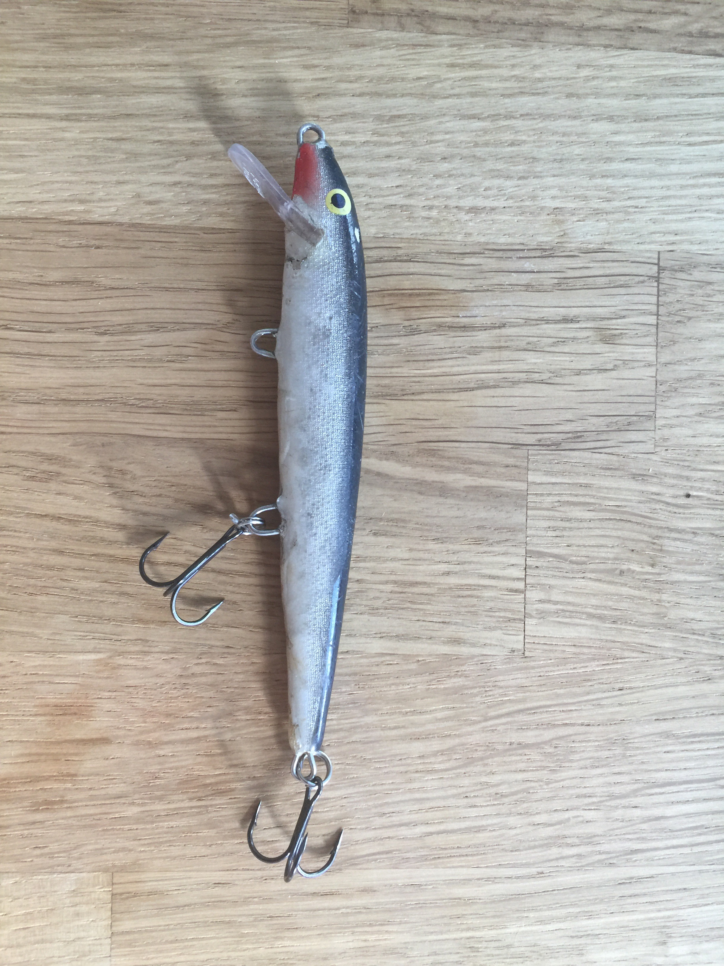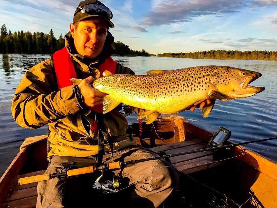 Jag tog mitt spinnspö och hoppade i min lilla älvbåt, satte färd mot ett ställe där jag misstänkte att det var läge för rejäl spöböj! Helt blankt vatten och midnattssolen som ännu värmde lite mot ansiktet gjorde färden otroligt behaglig. Väl framme ställer jag båten i läge uppströms och slänger ett kast bakom båten, för att med hjälp av motor och båt föra betet till ett stort bakvatten utifrån den hårda strömmen. Så fort jag känner min Rapala F11 S nå lugnvattnet och vibrationerna av gången avtagit så kommer ett våldsamt hugg. Jag nitar fisken stenhårt varpå Öringen plöjer över till mitten av fåran och gör en nedströms rusning säkert 50-60m och över mot ett grundområde.