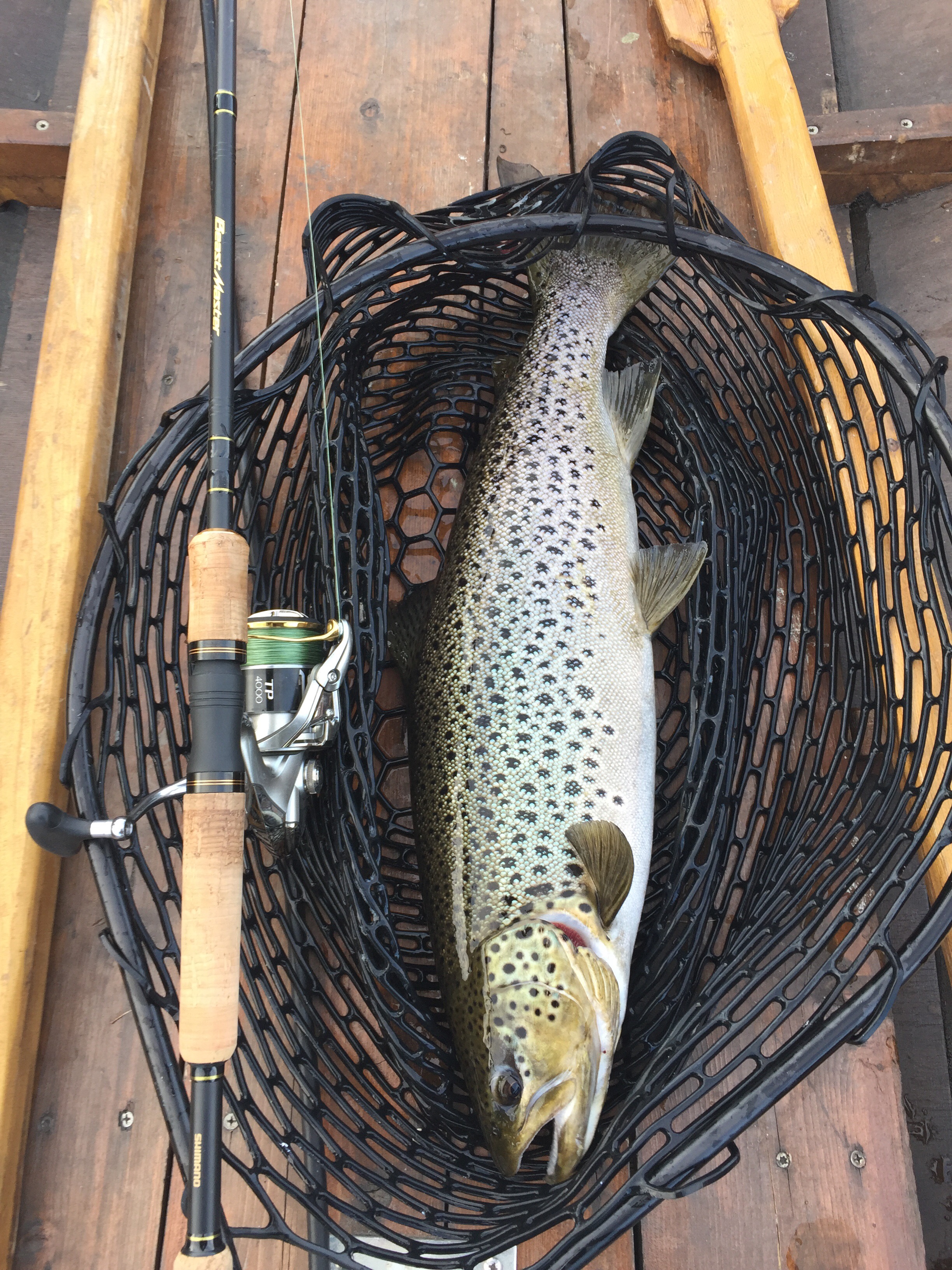 Jag följer snällt efter och fightar fisken bland stenar och forsande vatten. Fisken ger upp och jag håvar säkert. Kring 2,8kg helt galen fisk återutsätts. Jag tänker direkt ”undra hur en 6kilos känns på min nya utrustning?” ”och vilken kraft i denna rulle!”