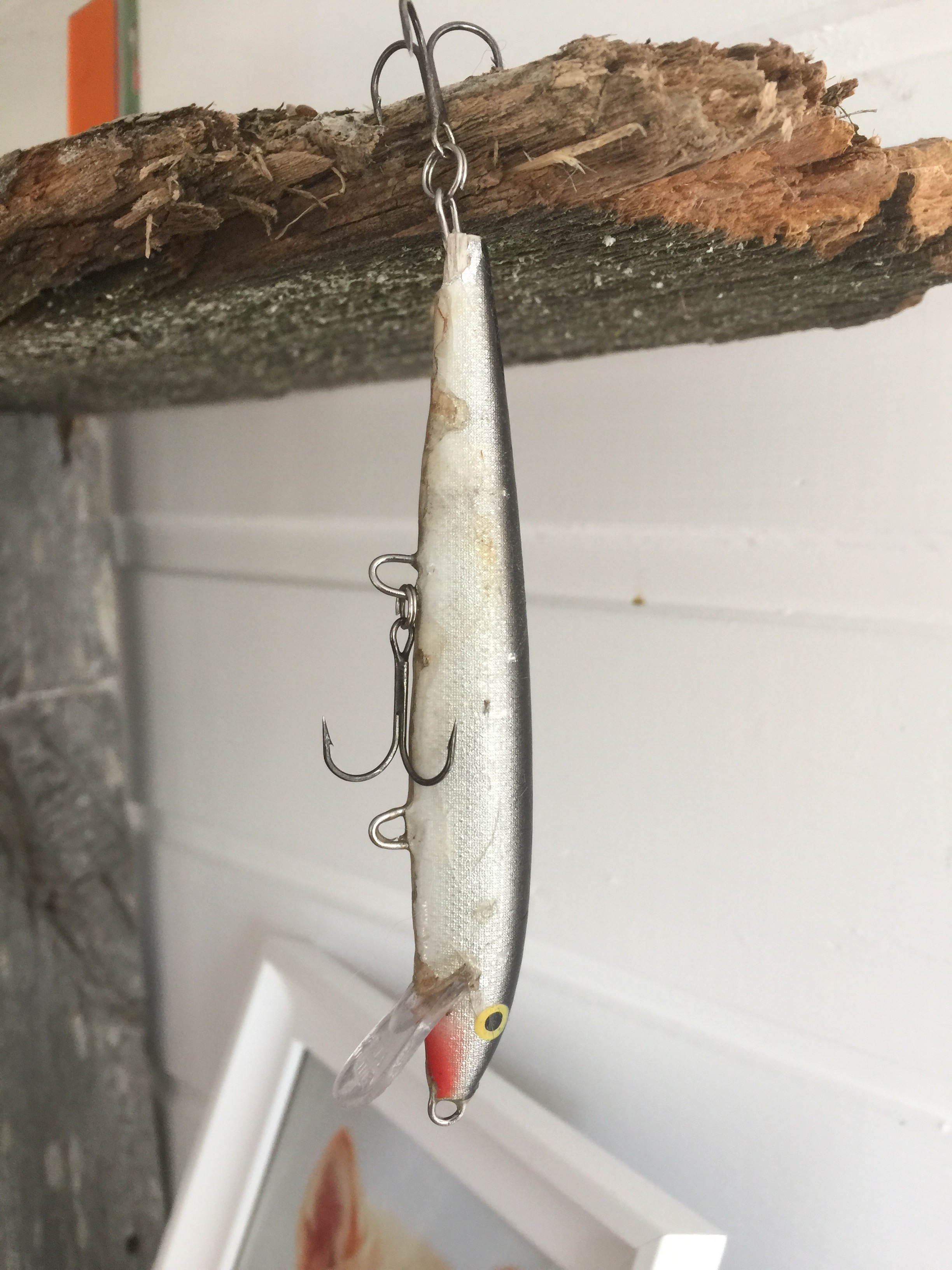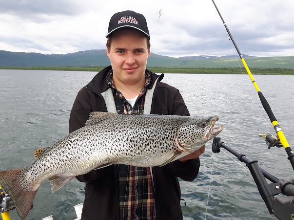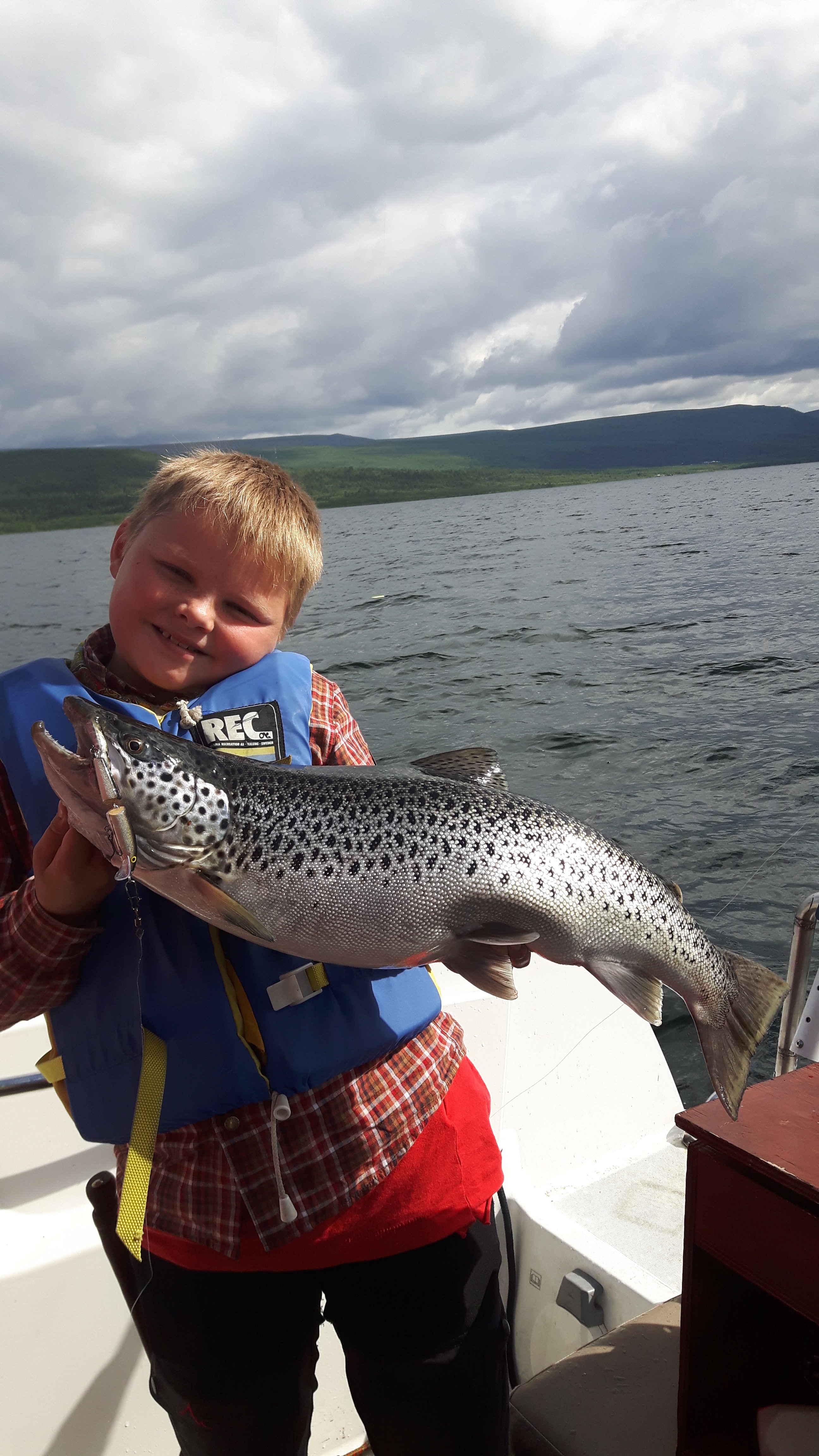 Denna dag var förutsättningarna riktigt bra. Vi startade dagen över ett djupområde. Ekolodet visade inte riktigt det jag ville så jag satte kurs högre upp i sjön. Vi hinner bara köra en kort bit innan det ylar friskt i en av rullarna. Minstingen i besättningen som är 11år får kämpa riktigt hårt. Efter ca 20minuter är både grabben och fisken slutkörd och jag kan sätta en riktigt fet öring i håven. Rapalas RCD digitalvåg visar 4,12kg och Grabben poserar stolt med sitt livs öring! Öringen tog en Scatterrap Jointed 9cm fiskad helt i ytan.
