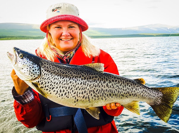 Nästa hugg är också stenhårt och mamman i båten ställs på prov. Med lite muntlig support och nervösa knän håvar vi in en ännu tjockare öring! Det är bara för kul det här! Hon är en riktig storfiskare på röding men sådana öringar som dessa har hon bara drömt om. Ännu en livs öring vägs till 4,2kg! Denna tog också helt ytligt och jag får nu tyvärr pensionera min gamla F11 silver/svart. Den har varit med ett par säsonger och landat massvis med fina öringar och harrar m.m.