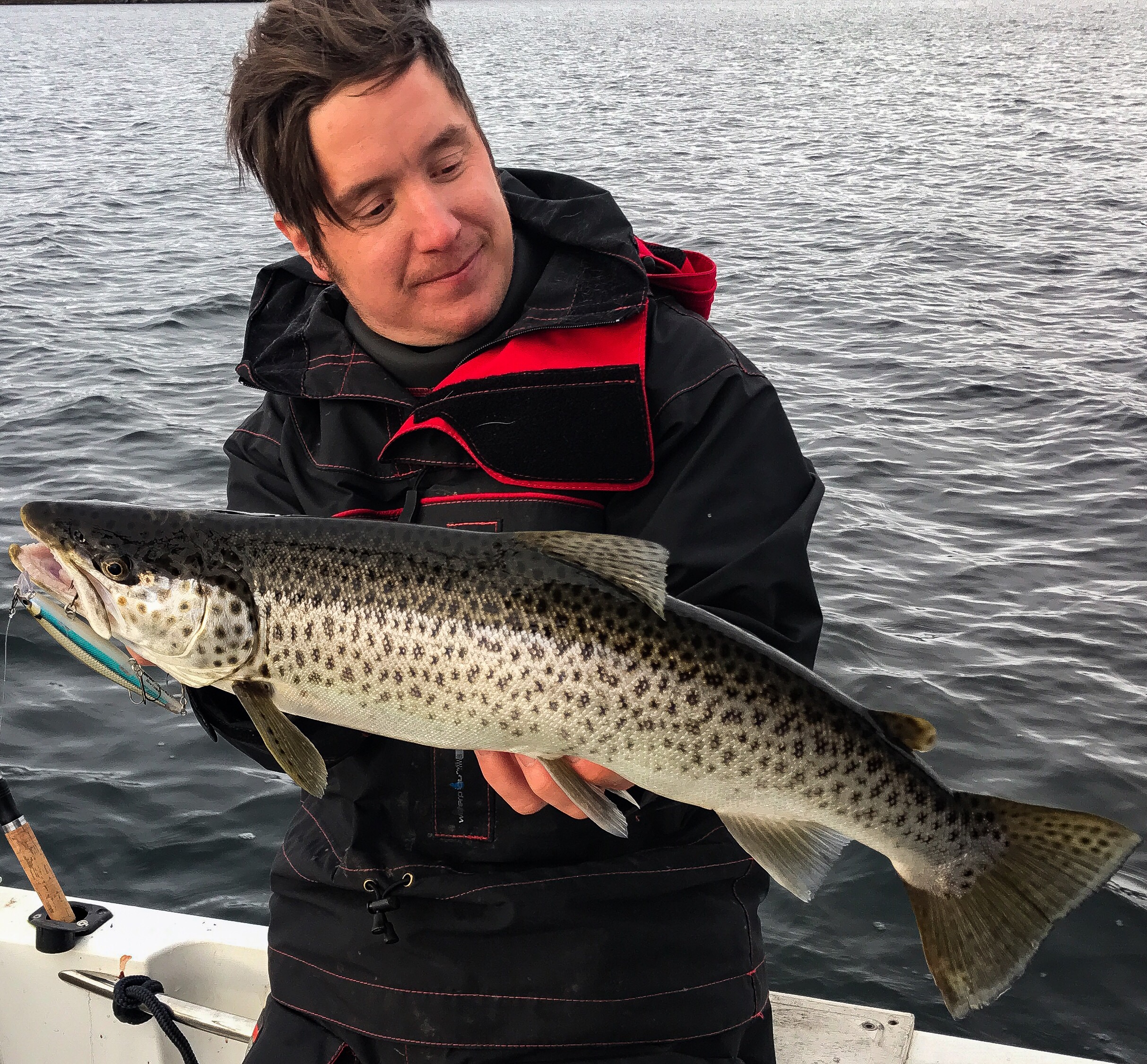 Jag knöt på sommarens hetaste storfiskwobbler Rapala Scatter rap Jointed 9cm i färgen S. Denna wobbler är extremt bra när det är kallt i vattnet, då den simmar mkt naturtroget och livligt redan vid 1,6knop. Med mackan och kaffet värmandes i magen kryssade vi ute på djupet vid en närliggande grynna. Efter kanske 1h nötande börjar Min Shimano Tekota 500 skrika och spöt stod i en grym böj! Linan bara sprutar ur rullen och långt bakom båten syns en grym svallvåg och bred stjärtspole. Denna är potentiell 4+ meddelar jag kompisen som snabbt vevar in sitt bete. Efter en ganska lugn slutspurt av fighten lyckas vi landa en praktpjäs på 6kg! Helt otroligt fet dessutom. Är det sant?! 2 år i följd samma datum en reg-öring! Vilka vackra fiskar alltså! Vi fiskar en liten stund till och får en 3kgs öring som också får simma hem innan vi åker i land. Ibland går det bra och ibland går det trögt.