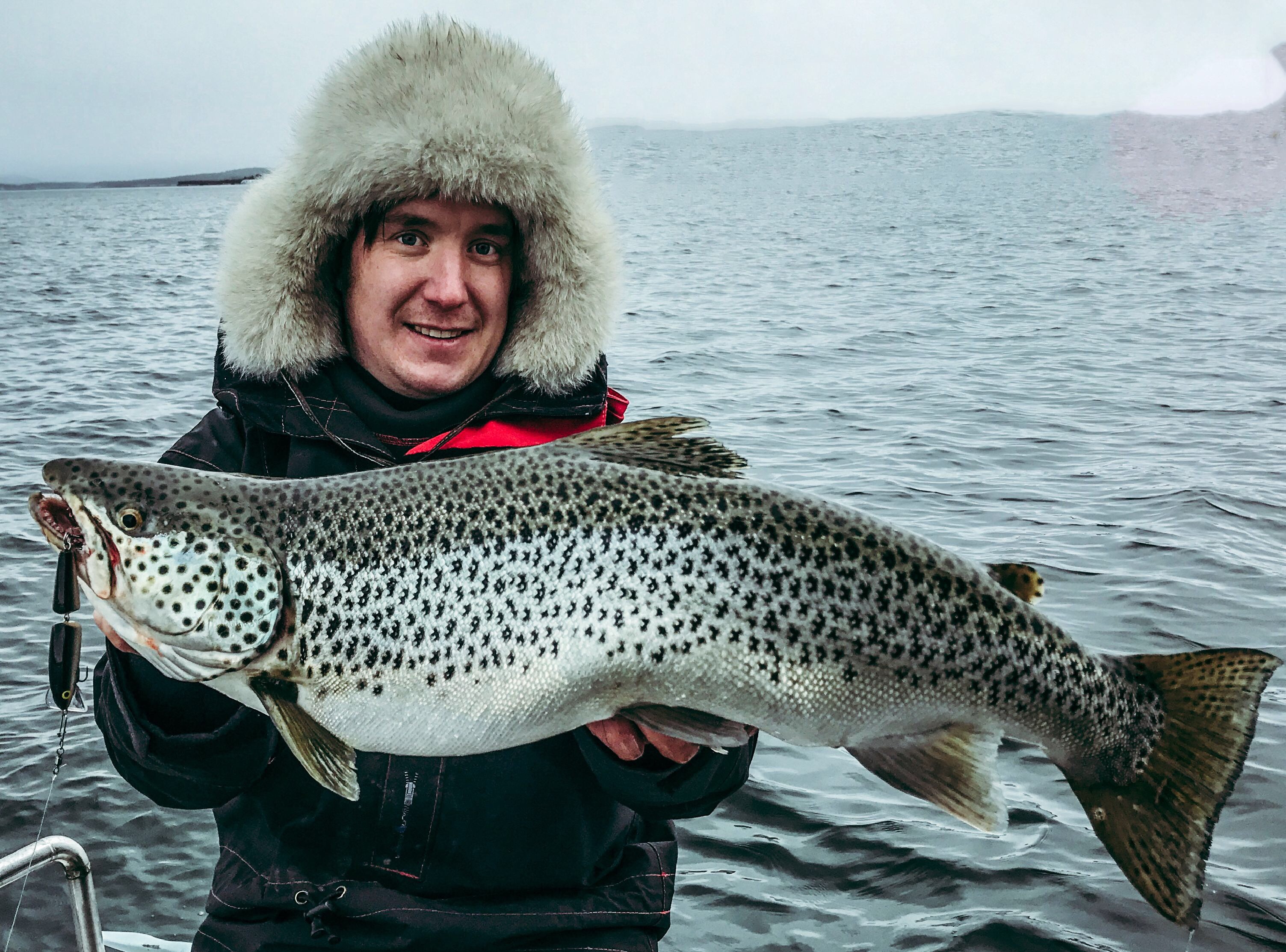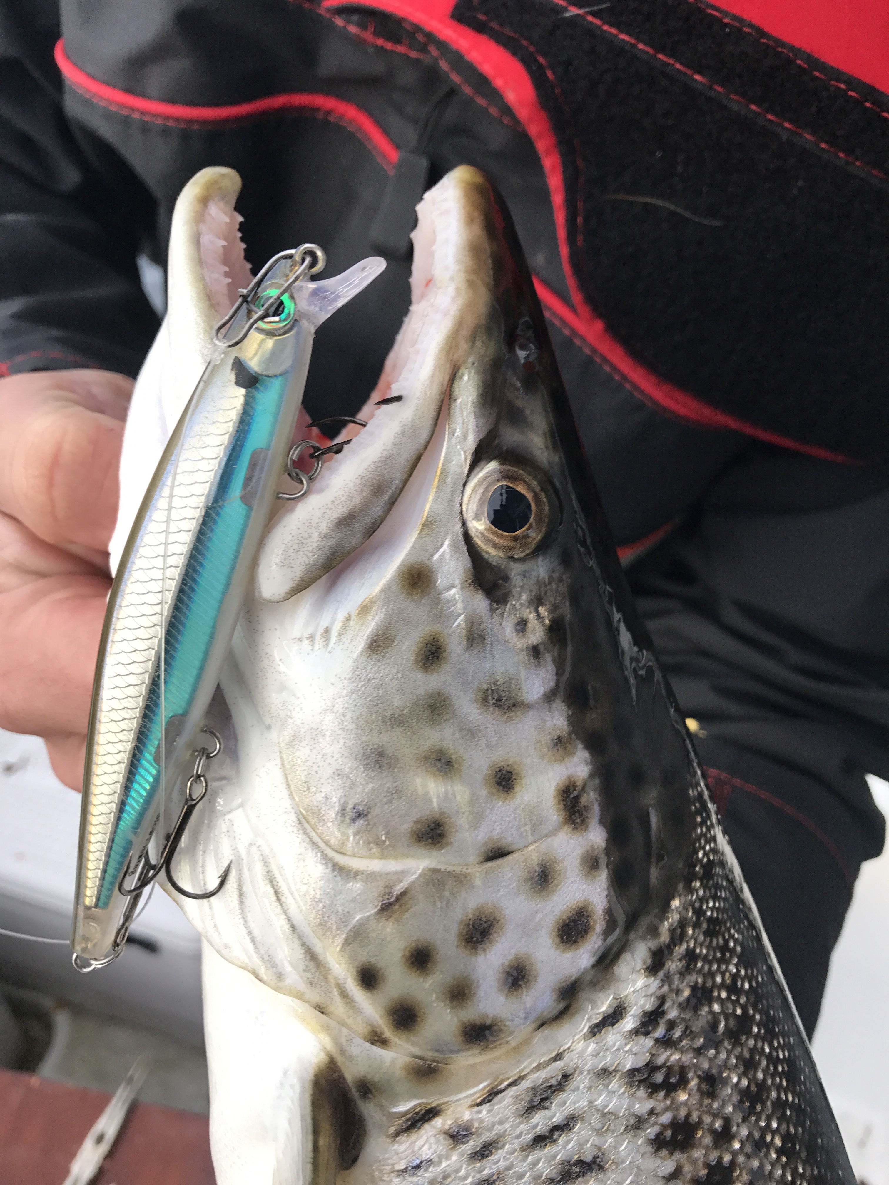 Efter 6veckor utan fiske så bestämde jag mig för att försöka lyckas matcha fjolårets grymma fisk från 14e Oktober. De flesta stora öringar tar helt ytligt på naturtrogna wobbler som Rapala F11 mfl. Nu var vattnet så kallt som 3-5,5grader celcius. Det är nu man måste tänka till! Öringen måste känns att det är värt att göra en attack eller välja att följa efter och undersöka vad det är som kommer simmande. Det finns ingen anledning att köra snabbt även om det kanske är långt mellan fiskarna denna tid på året. Därför valde jag att fiska sakta både med spinn och lite bontrolling. Vi spinnfiskade en hel del men vid lunch bestämde vi oss för att släpa varsin wobbler efter båten.