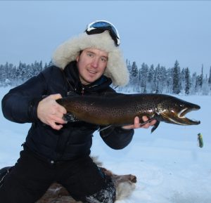 Jag tror länge att detta ska bli personbästa på ”pimpelfiske” då öringen kämpar i närmare 10minuter. Ett säkert grepp i gälbågen gör att jag kan lyfta en 64cm lång 3,18kg tung öringhane mot kameran. Vilken lycka! Vilken fight! Lite kort med hg för ett pb men näst största på pimpel någonsin på årets första dag! Några fler hugg blir det inte men väl värd skotertur ändå. Ha det gott och glöm inte isdubbar när ni är på strömsatta områden!